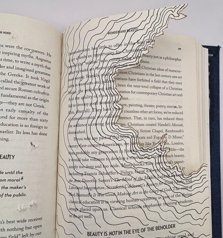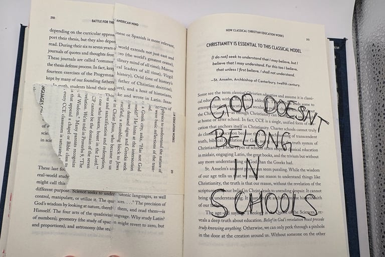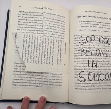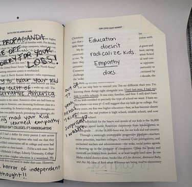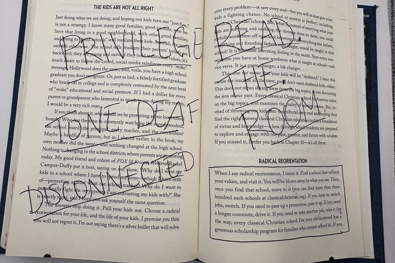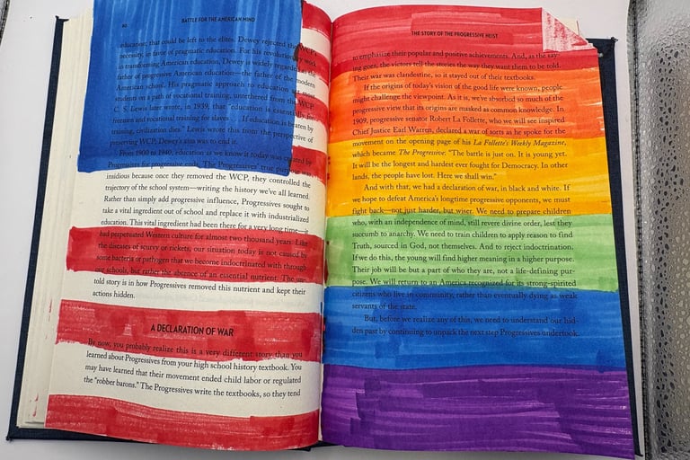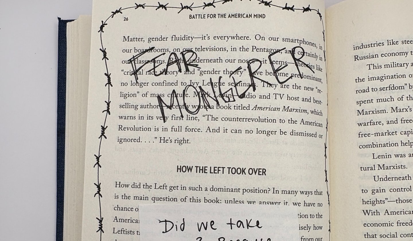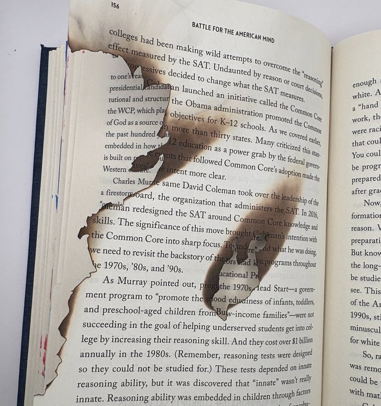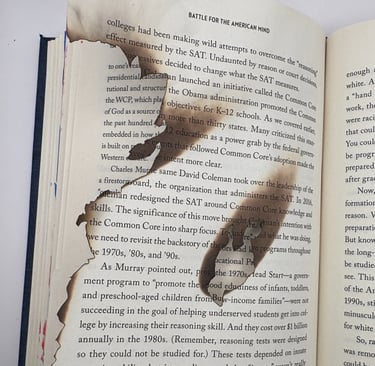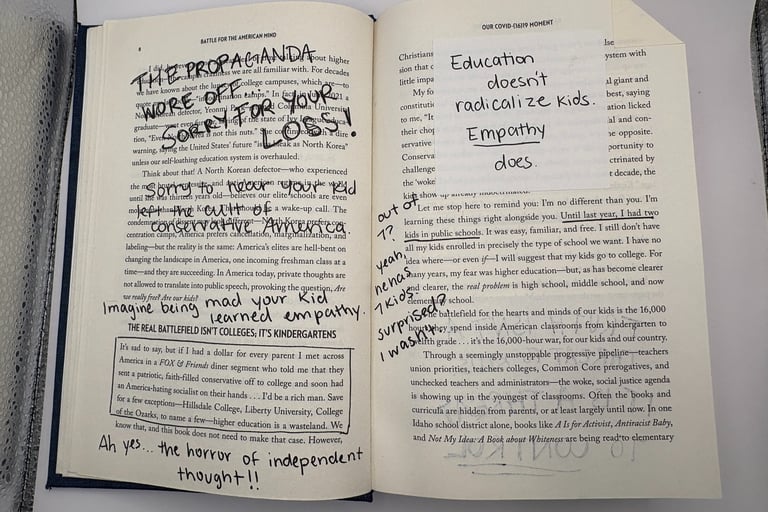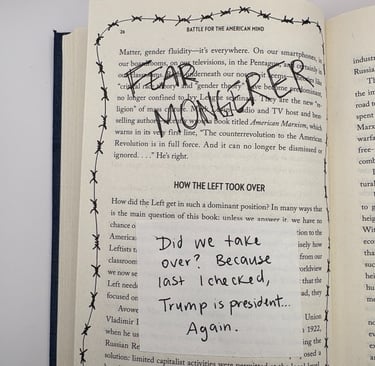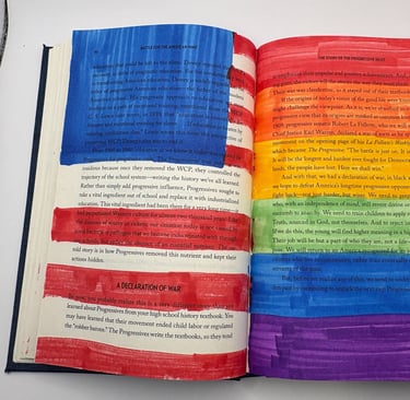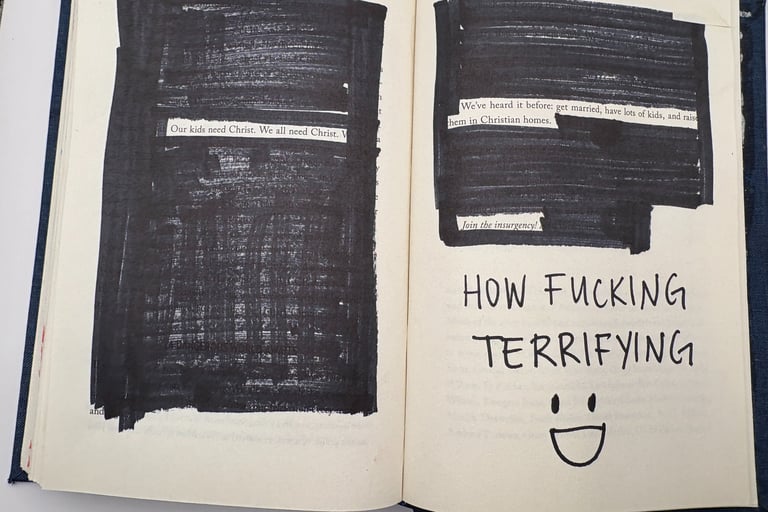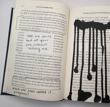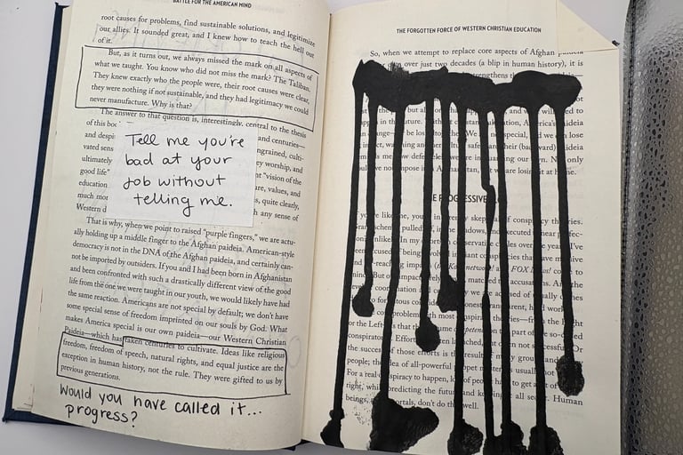 Battle for the American Lie reimagines Pete Hegseth’s Battle for the American Mind as both object and battleground. Through rebinding, annotation, and physical alteration— writing, drawing, shredding, burning— I confront and reject the written propaganda. The piece functions as an intervention into fascist rhetoric and a reclamation of the narrative space it attempts to control.